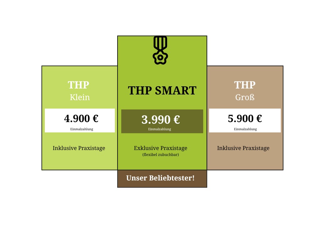 Entscheide dich für den großen Klassiker: Das Gesamtpaket mit allen Praxistagen und Tutorials. Oder starte mit dem THP Smart online durch. Die Praxistage buchst du dann separat später dazu. Wir sind nicht nur im Unterricht flexibel, sondern finden auch ganz sicher das richtige Ausbildungsmodell für dich und deine Zukunft. Lass uns persönlichen sprechen und dir deinen persönlichen Einstieg ermöglichen: